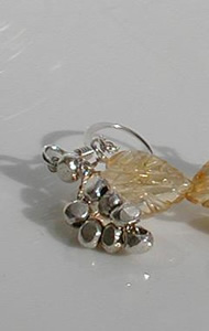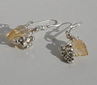 カレンシルバーと天然シトリンのぶどうちゃんです。銀線をねじってツルを表現しています。シトリンはバイカラー(透明とシトリンイエロー)で、あたる光りによって表情がかわります。金具はシルバー925です。イヤリングをご希望の場合は問い合わせフォームよりメールにてご相談下さいませ。